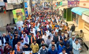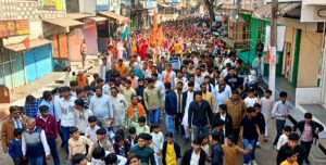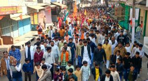 रविवार को नगर में भव्य हिंदू सम्मेलन का आयोजन सम्पन्न हुआ है। नगर में दो अलग- अलग स्थानों से भव्य चल समारोह एवं कलश यात्रा निकाली गई। जोकी आयोजित चल समारोह में नगर के नागरिकों ने हाथों में केसरिया ध्वजा थामे, महिलाओं ने सर पर कलश धारण कर, बैंड-बाजे, ढोल-ताशो की धुन के साथ ही हर घर भगवा एक ही नाम, एक ही नारा गूंजेगा, भारत का बच्चा-बच्चा जय श्री राम बोलेगा की धुन पर थिरकते, नाचते, झूमते हुए नजर आए। नगर में चल समारोह में भगवान श्री राम व बाहुबली हनुमान की झांकी आकर्षण का केंद्र रही। चल समारोह का नगर में नागरिकों ने जगह-जगह फूलों की पंखुड़ियो से भव्य स्वागत किया।