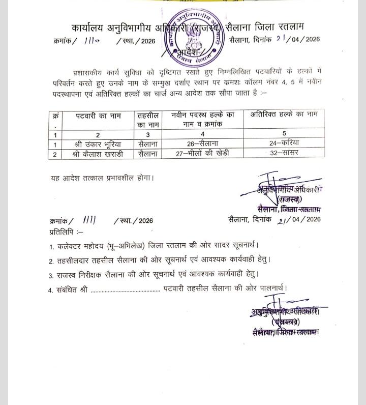 रतलाम- (Ratlam) प्रशासनिक कार्य सुविधा को ध्यान में रखते हुए अनुविभागीय अधिकारी (राजस्व) सैलाना द्वारा पटवारियों के हल्कों में महत्वपूर्ण परिवर्तन किया गया है। इस संबंध में आदेश जारी करते हुए संबंधित पटवारियों को नए पदस्थापन स्थल एवं अतिरिक्त हल्कों का प्रभार सौंपा गया है।
