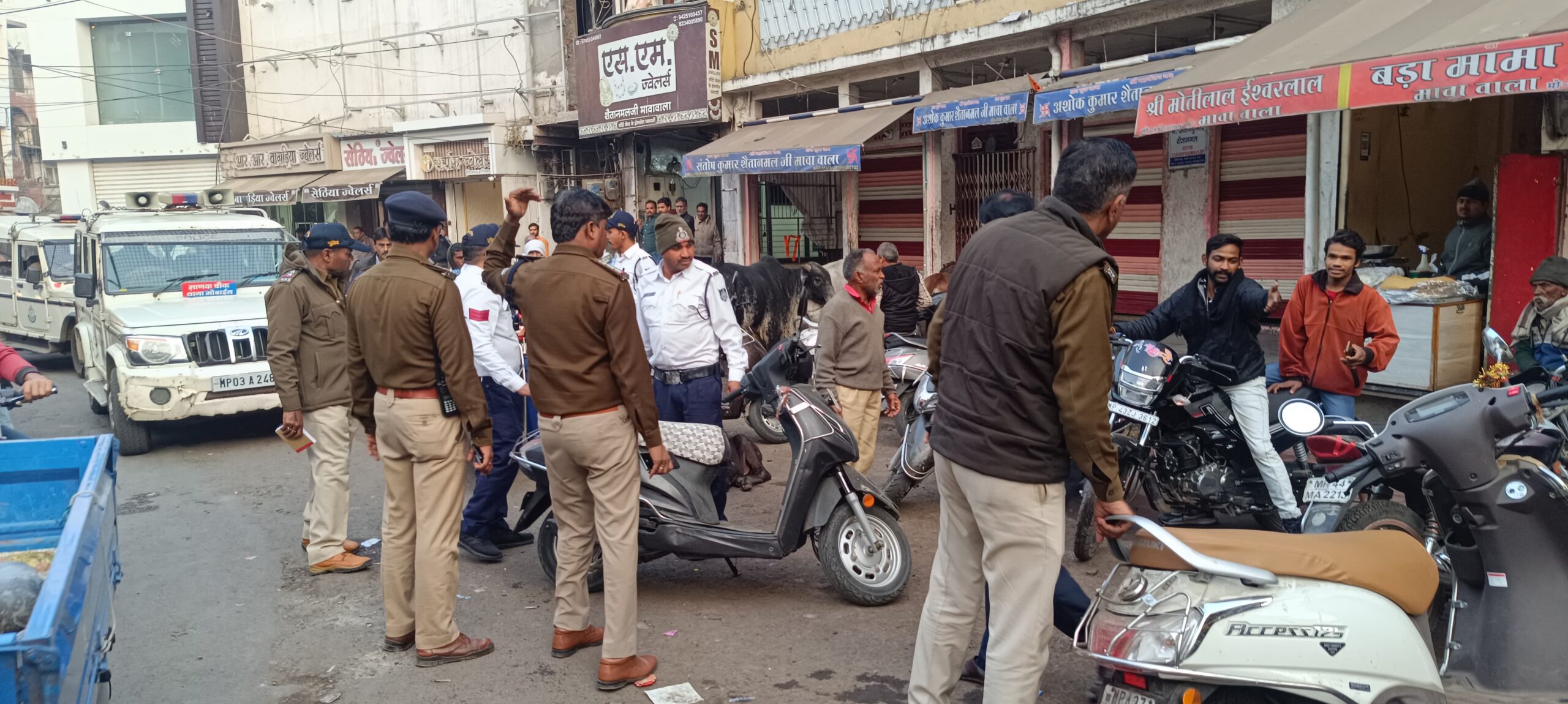 रतलाम (Ratlam,mp)- रतलाम जिला पुलिस अधीक्षक अमित कुमार (भा.पु.से.), अतिरिक्त पुलिस अधीक्षक राकेश खाखा (रा.पु.से.), उप पुलिस अधीक्षक यातायात अनिल रॉय के निर्देशन में रतलाम यातायात थाना से सूबेदार अनोखीलाल परमार, उनि. करण सिंह कटारा, सउनि. सर्वेश द्विवेदी, प्र.आर. गुलाब चंद्र मीणा, आर. शिवकुमार, आर. भगतसिंह, आर. मोहन धार्वे, एवं माणकचौक थाना प्रभारी सुरेंद्र सिंह गडरीया, सउनि. शिवनाथ सिंह राठौर, व रतलाम नगर निगम की टीम द्वारा संयुक्त रुप से रतलाम शहर में यातायात को सूचारु बनाने के लिए एक दिवस एक रोड अभियान के तहत मंगलवार को शहर के चौमुखीपुल से चाँदनी चौक व तोपखाना से गणेश देवरी तक के मार्ग पर अव्यवस्थित रुप से लगे वाहनो, सब्जी फ्रुट के हाथ ठैला गाडी वालो, फुटपाथ पर सब्जी बेचने वालो व दुकानो के बाहर फुटपाथ पर रखे सामान को दुकानदारो को समझाईस देकर हटवाया जाकर शहर सराय से चौमुखीपुल से चाँदनी चौक व तोपखाना से गणेश देवरी तक के मार्ग को यातायात के लिए सूचारु से किया गया। साथ ही नगर निगम की टीम एवं यातायात की टीम द्वारा चालानी कार्यवाही भी की गई। इसके अतिरिक्त उप पुलिस अधीक्षक यातायात अनिल रॉय द्वारा स्थान पर उपस्थित समस्त दुकान संचालको व व्यापारीयो की यातायात को लेकर हो रही समस्या व उसके निराकरण के सुझाव को लेकर चर्चा की गई। यह अभियान रतलाम शहर में यातायात को सुगम, सुरक्षित व सूचारु बनाने के लिए लगातार जारी रहेगा।अभियान में यातायात पुलिस रतलाम का सहयोग करे।