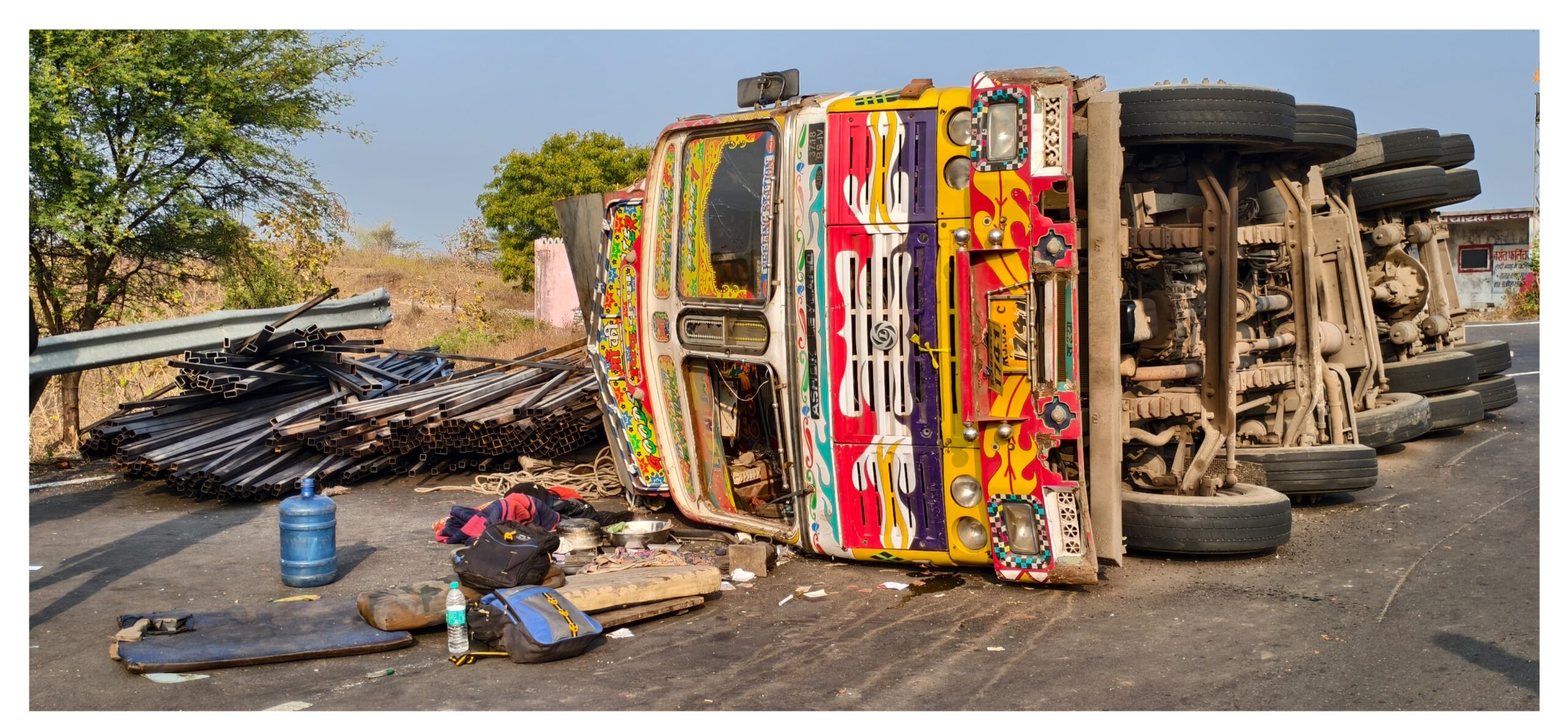 सैलाना के केदारेश्वर घाट पर लोहे के पाइप से भरा ट्रक पलटा,बड़ा हादसा टला