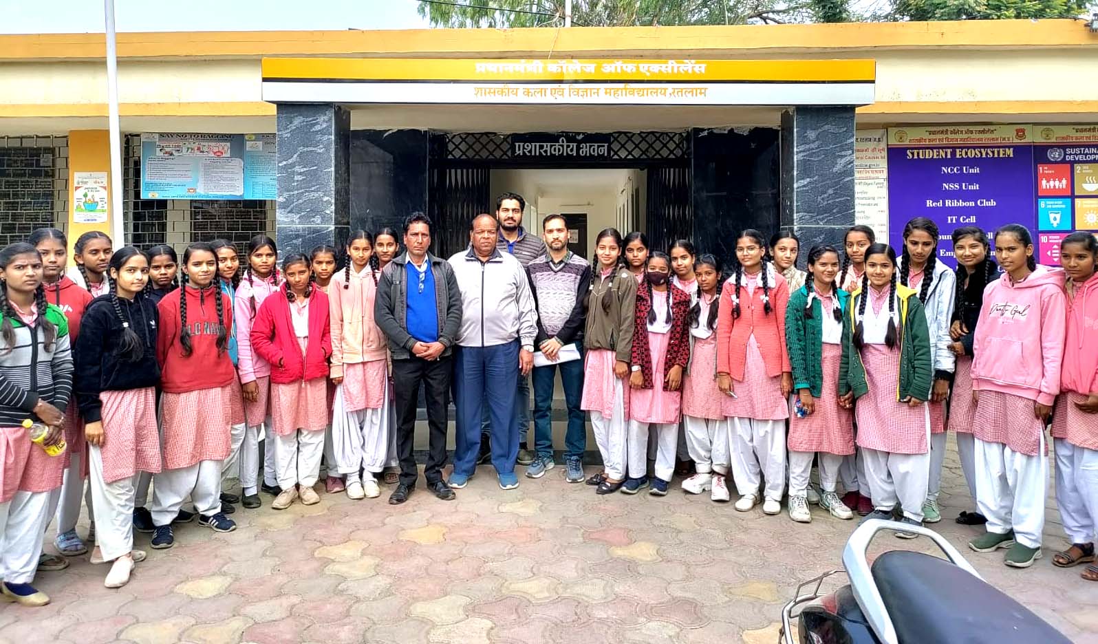 रतलाम (Ratlam,mp)- महारानी लक्ष्मीबाई उच्चतर माध्यमिक विद्यालय की कक्षा 12 वीं के विद्यार्थियों ने प्रधानमंत्री कॉलेज आफ एक्सीलैंस, शासकीय कला एवं विज्ञान महाविद्यालय का भ्रमण किया। विद्यार्थियों ने प्रभारी प्राचार्य डॉ. एम.एल. बड़गोत्या से भेंट की। पश्चात प्रशासकीय भवन का भ्रमण किया। विद्यार्थियों ने डाटा साइंस विभाग में जाकर डाटा साइंस विभाग की बारीकियों को जाना। क्रीड़ा विभाग के भ्रमण के दौरान डॉ.रूपेंद्र फरस्वाण ने क्रीड़ा विभाग में खेल गतिविधियों के बारे में विद्यार्थियों को बताया। विद्यार्थियों ने ज्ञान भवन एवं कंप्यूटर विभाग का भ्रमण किया। जहां कंप्यूटर साइंस के बारे में प्रो.नितेश पाठक एवं राहुल भंडारी द्वारा विद्यार्थियों को जानकारी प्रदान की गई।भौतिक विभाग व रसायन विभाग के भ्रमण में प्रो. एल.एस. चोंगड़ द्वारा विद्यार्थियों को जानकारी प्रदान की गई। इसके पश्चात विद्यार्थियों ने लाइब्रेरी का भ्रमण किया तथा ई लाइब्रेरी के बारे में जानकारी प्राप्त की। प्राणी शास्त्र विभाग में विद्यार्थियों ने प्रो.अनीस मोहम्मद से प्राणी शास्त्र के बारे में जानकारी प्राप्त की। वनस्पति शास्त्र विभाग, माइक्रोबायोलॉजी का भी भ्रमण किया। भ्रमण के दौरान रतलाम महाविद्यालय के प्रो. अभिजीत बिश्नोई एवं डॉ. दिलीप सिंह पंवार विद्यार्थियों के साथ सभी विभागों में उपस्थित रहे।