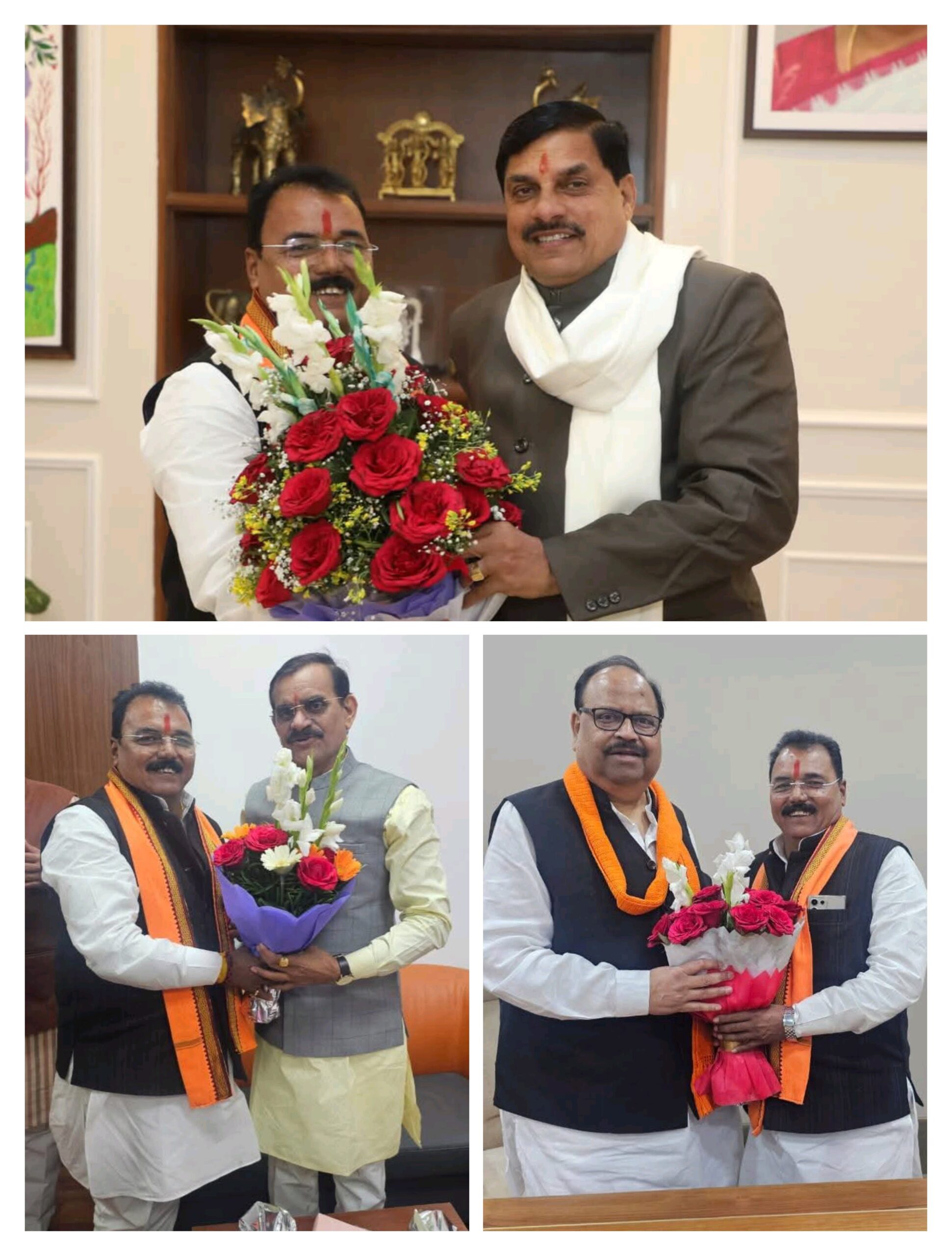भोपाल/रतलाम (Bhopal,Ratlam,mp)- भाजपा जिलाध्यक्ष का पद दोबारा मिलने पर नवागत जिलाध्यक्ष प्रदीप उपाध्याय ने भोपाल में मुख्यमंत्री डॉक्टर मोहन यादव, प्रदेश भाजपा अध्यक्ष वीडी शर्मा, मध्यप्रदेश शासन में कैबिनेट मंत्री व रतलाम शहर विधायक चैतन्य कुमार कश्यप से सौजन्य भेट की। इसी दौरान सीएम डॉक्टर यादव सहित कई बड़े नेताओं ने जिलाध्यक्ष उपाध्यक्ष का फूलों का गुलदस्ता देखकर व मिठाई खिलाकर बधाई दी। इसी दौरान पूर्व जिलाध्यक्ष राजेंद्र सिंह लुनेरा, प्रवीण सोनी, भाजपा युवा मोर्चा जिलाध्यक्ष विप्लव जैन भी उपस्थित थे।