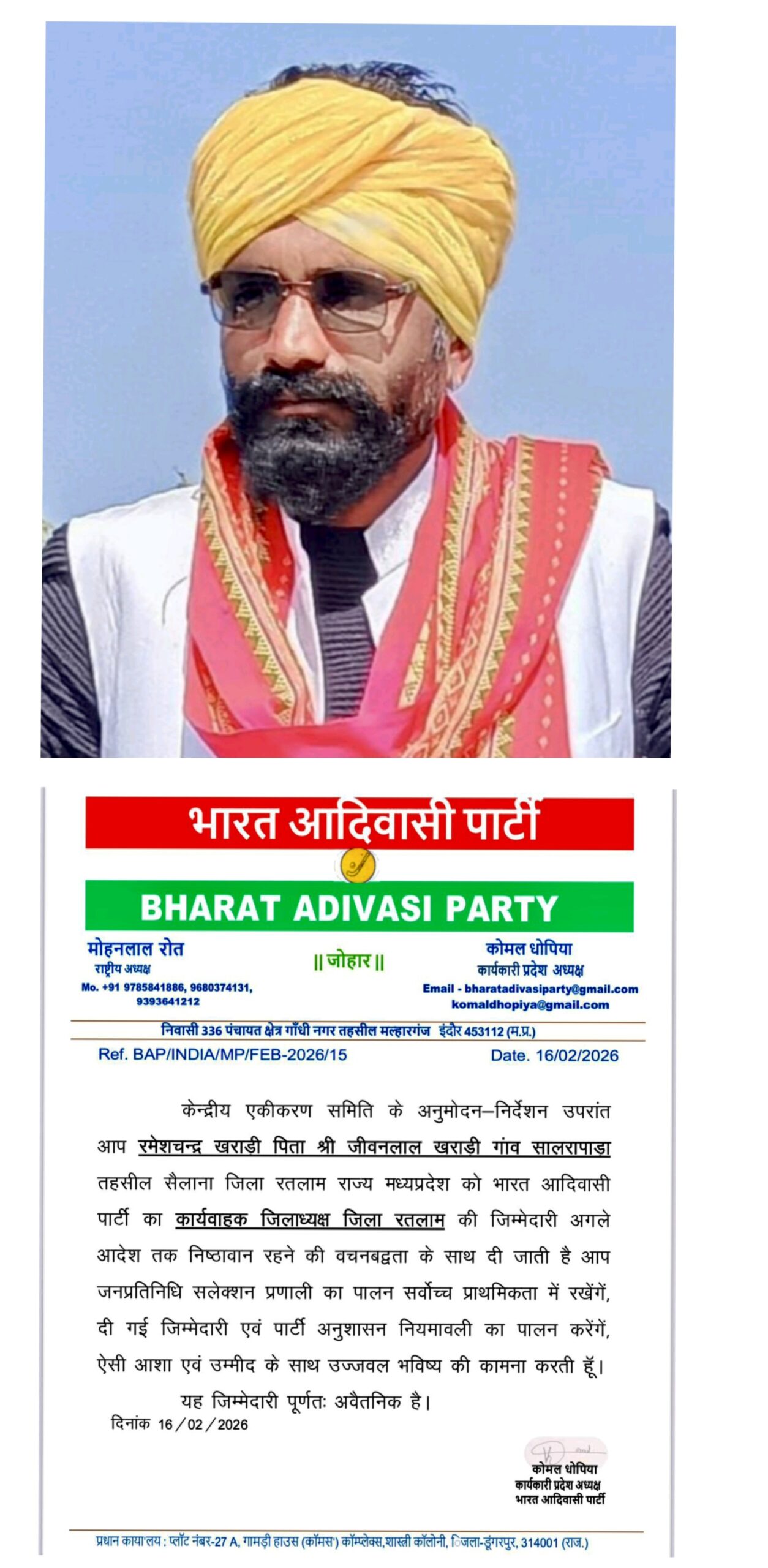 रतलाम- (Ratlam) भारत आदिवासी पार्टी की जिला और ब्लॉक की कार्यकारिणी भंग करने के बाद सैलाना जनपद के सालरापाड़ा सरपंच रमेश चंद्र खराडी को जिला अध्यक्ष (कार्यवाहक) नियुक्त किया है।