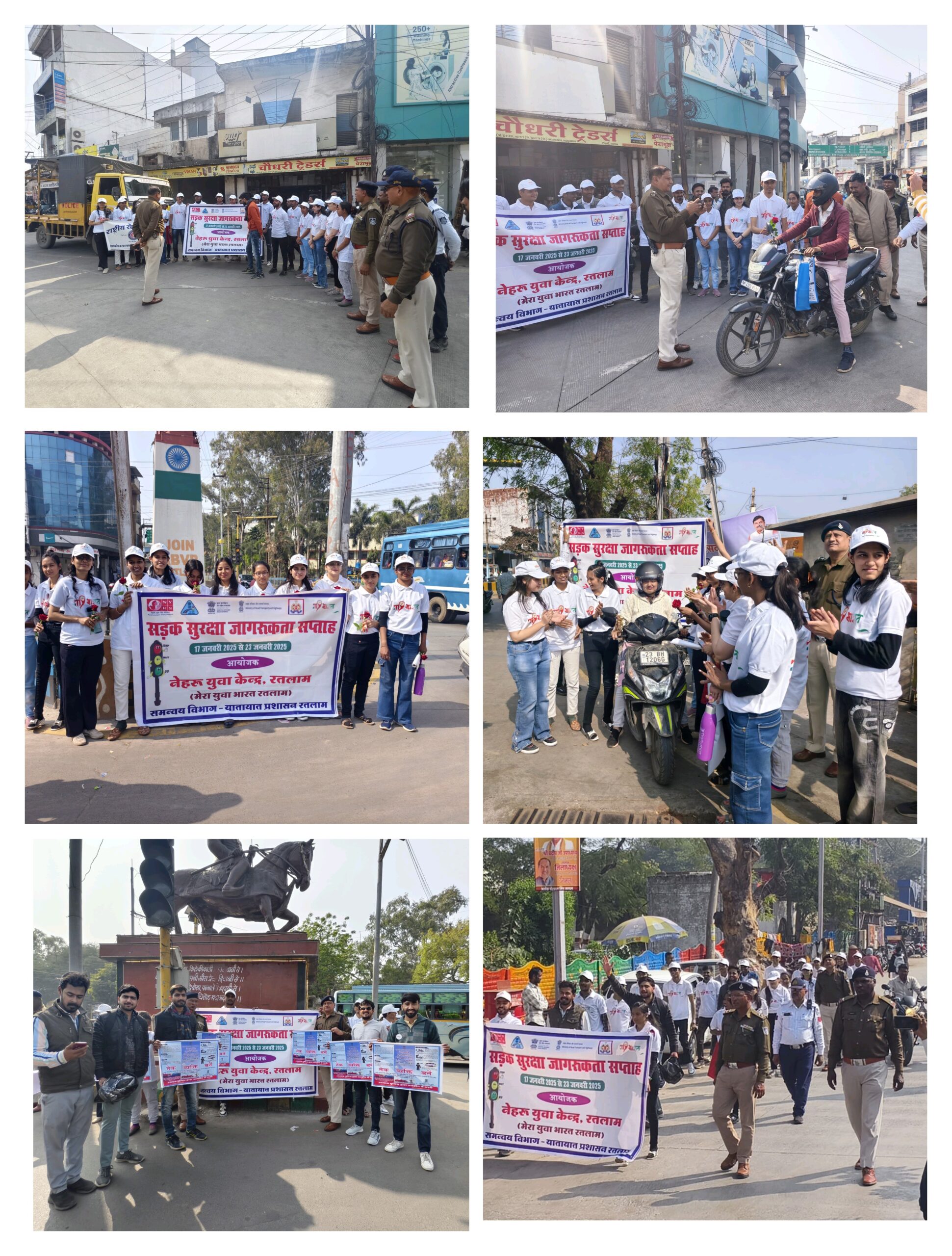 रतलाम (Ratlam,mp)- रतलाम जिला पुलिस अधीक्षक अमित कुमार (भा.पु.से.) एवं अतिरिक्त पुलिस अधीक्षक राकेश खाखा (रा.पु.से.) के मार्ग दर्शन में उप पुलिस अधीक्षक यातायात अनिल कुमार राय एवं यातायात थाना प्रभारी निरीक्षक संतोष चौरसिया , सूबेदार अनोखीलाल परमार द्वारा हमराह यातायात पुलिस बल सउनि. सर्वेश द्वीवेदी, सउनि. फरहतुल्ला मिर्जा, गुलाबचन्द्र मीणा, भगत सिंह एवं जिला युवा अधिकारी सौरभ श्रीवास्तव एवं नेहरु युवा केन्द्र (युवा कार्यक्रम एवं खेल मंत्रालय भारत सरकार) के सदस्यो द्वारा सडक सुरक्षा माह- 2025 के आयोजन के तहत रतलाम शहर के घौडा चौहारा, लोकेन्द्र टाकीज, सैलाना बस स्टेण्ड , राम मंदीर आदी मुख्य चौराहो पर सडक दुर्घटनाओ में कमी लाये जाने के उद्देश्य से एवं यातायात नियमों के पालन के लिए अनोखा जन- जागरुकता कार्यक्रम का आयोजन किया गया। जिसके तहत निम्नानुसार कार्य किये गये।