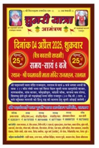 रतलाम (Ratlam,mp)- आगामी चैत्र शुक्ल की बड़ी नवरात्रि की सप्तमी 4 अप्रैल शुक्रवार को रतलाम के पद्मावती माता जी मंदिर राज महल पैलेस रोड से शाम को 6 बजे भव्य चुनरी यात्रा के आयोजन को लेकर एक बैठक का आयोजन 23 मार्च रविवार को शाम को 5 बजे बड़ा गोपाल मंदिर माणक चौक पर रखी गई है।