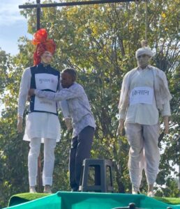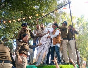 ट्रैक्टर-ट्राली के उपर फांसी के फंदे पर झुलता मुख्यमंत्री व किसान के पुतले को पुलिस ने हटवाया