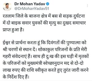 बाजना क्षेत्र में बस से हुई सड़क दुर्घटना मे बाइक पर सवार दो युवकों की मृत्यु का दुखद समाचार प्राप्त हुआ है। ईश्वर से प्रार्थना करता हूं कि दिवंगतों की पुण्यात्मा को श्री चरणों से स्थान दें। साथ ही दुःख की इस घड़ी में मृतकों के परिजनों को मुख्यमंत्री स्वेच्छानुदान मद से दो-दो लाख रुपए की राशि स्वीकृत करते हुए तुरंत जारी करने के निर्देश दिए हैं।