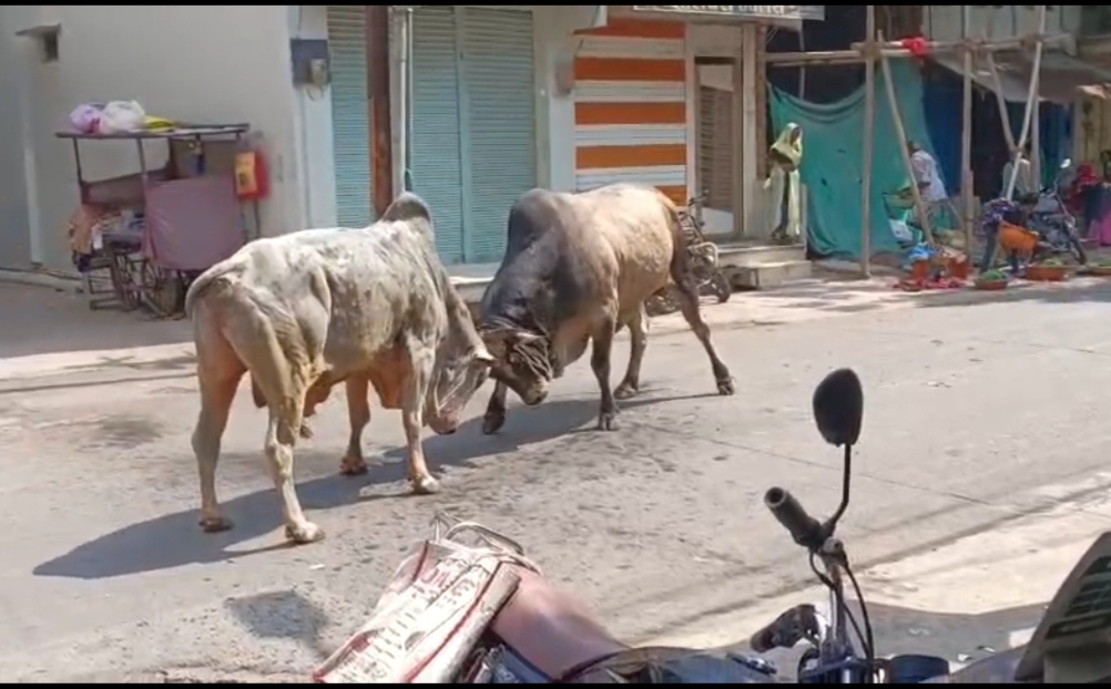 रविवार को सुबह नगर के सदर बाजार मेंन रोड पर दो सांडों की लड़ाई छिड़ गई। जिससे मेंन रोड से गुजरने वाले आम नागरिकों व वाहन चालकों को वहां से गुजरने में काफी दिक्कतो का सामना करना पड़ा। कई देर तक दोनों सांड आपस में लड़ते दिखाई दिए। लोगों ने जैसे तैसे करके दोनो सांडों पर पानी डालकर झगड़े को शांत करवाने का प्रयास किया। लेकिन सांडों पर पानी का कोई भी असर नहीं हुआ। लोगों ने डंडो के सहारे सांडों को खदेड़ ना शुरू की। ओर दोनों सांडों को अलग अलग करके भगाया। लोगो का कहना है कि सांडों की वजह से कभी नगर मे गंभीर घटना हो सकती है।