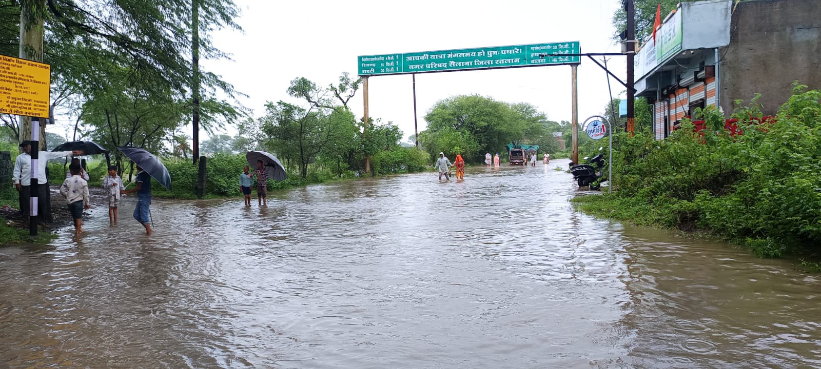 रतलाम- (Ratlam) जिले के सैलाना-शिवगढ़ मार्ग स्थित हनुमान सागर तालाब के ओवरफ्लो होने के बाद उसका पानी सड़क तक आने लगा है। यहाँ तालाब के अलावा आस-पास के खेतों जा पानी भी आता है। छोटा नाला होने के कारण इस मुख्य मार्ग पर बारिश की सीजन में यह मिनी तालाब का रूप ले लेता है। हाल ही कि मूसलाधार बारिश में इधर से गुजरने वाले राहगिरों व स्कूल के छात्र-छात्राओं को घुटने घुटने तक पानी को पार कर जाने को मजबूर होना पड़ रहा है।