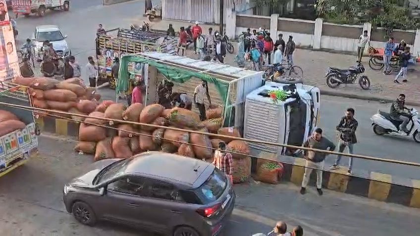 रतलाम शहर मे तेज रफ्तार का कहर, मटर से भरा मिनी ट्रक पलटा, बड़ा हादसा टला