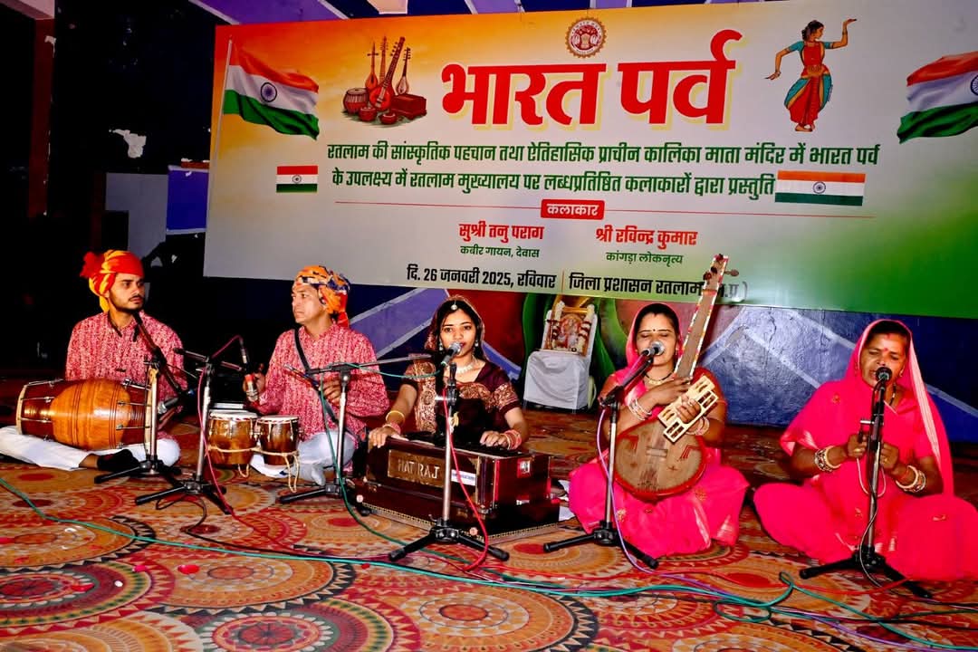 रतलाम (Ratlam,mp)- गणतंत्र दिवस की संध्या पर रतलाम स्थित कालिका माता परिसर में लोकतंत्र के लोक उत्सव भारत पर्व का गरिमामय आयोजन किया गया। इस अवसर पर कलाकारों द्वारा देश के सांस्कृतिक रंगों की छठा बिखेरी गई। कार्यक्रम का शुभारंभ दीप प्रज्वलित कर किया गया।