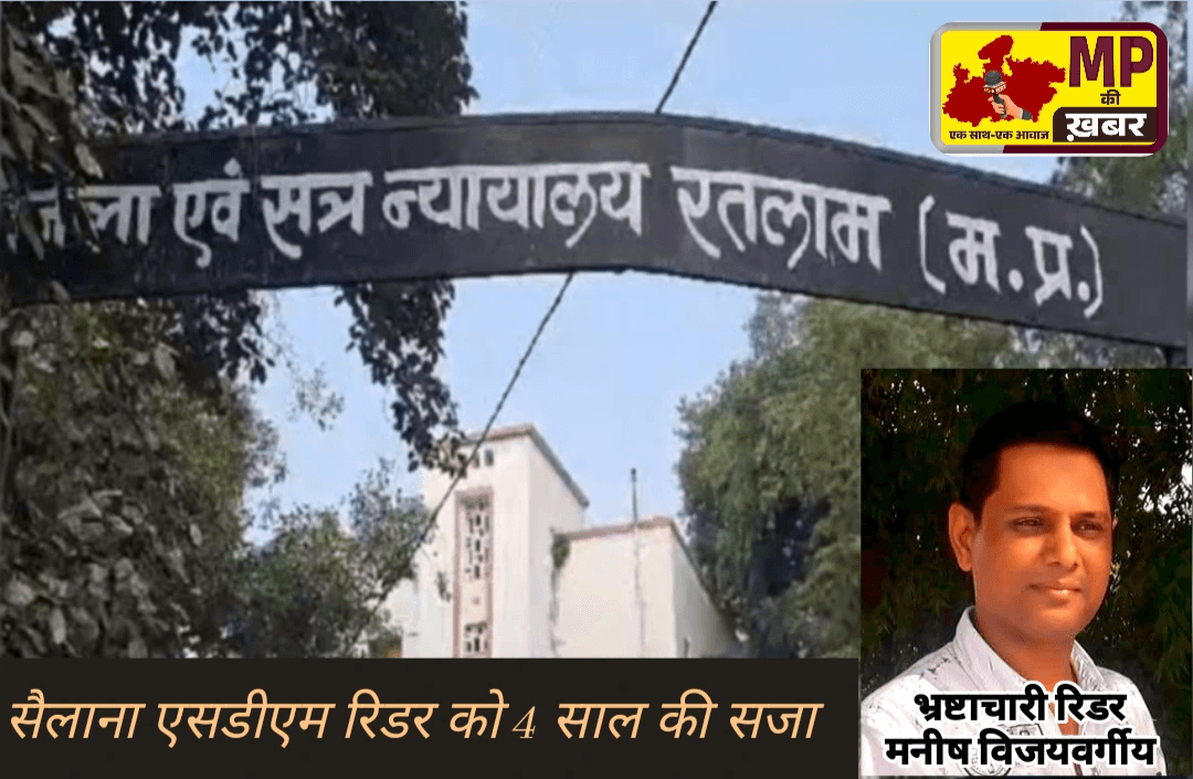 सैलाना के तत्कालीन एसडीएम के भ्रष्टाचारी रिडर मनीष विजयवर्गीय को भ्रष्टाचार निवारण अधिनियम के विशेष न्यायाधीश आदित्य राव ने चार साल के कारावास की सजा सुनाई है। उस पर दो हजार रुपए का अर्थदंड भी लगाया है। रीडर विजयवर्गी ने ट्यूबवेल खनन की अनुमति देने के बदले आवेदक हरि वल्लभ बामनिया से 5 हजार रुपए की मांग की थी और 3 हजार रुपए में सौदा करने यह राशि लेते हुए सन् 2019 में लोकायुक्त ने ट्रेप किया था।