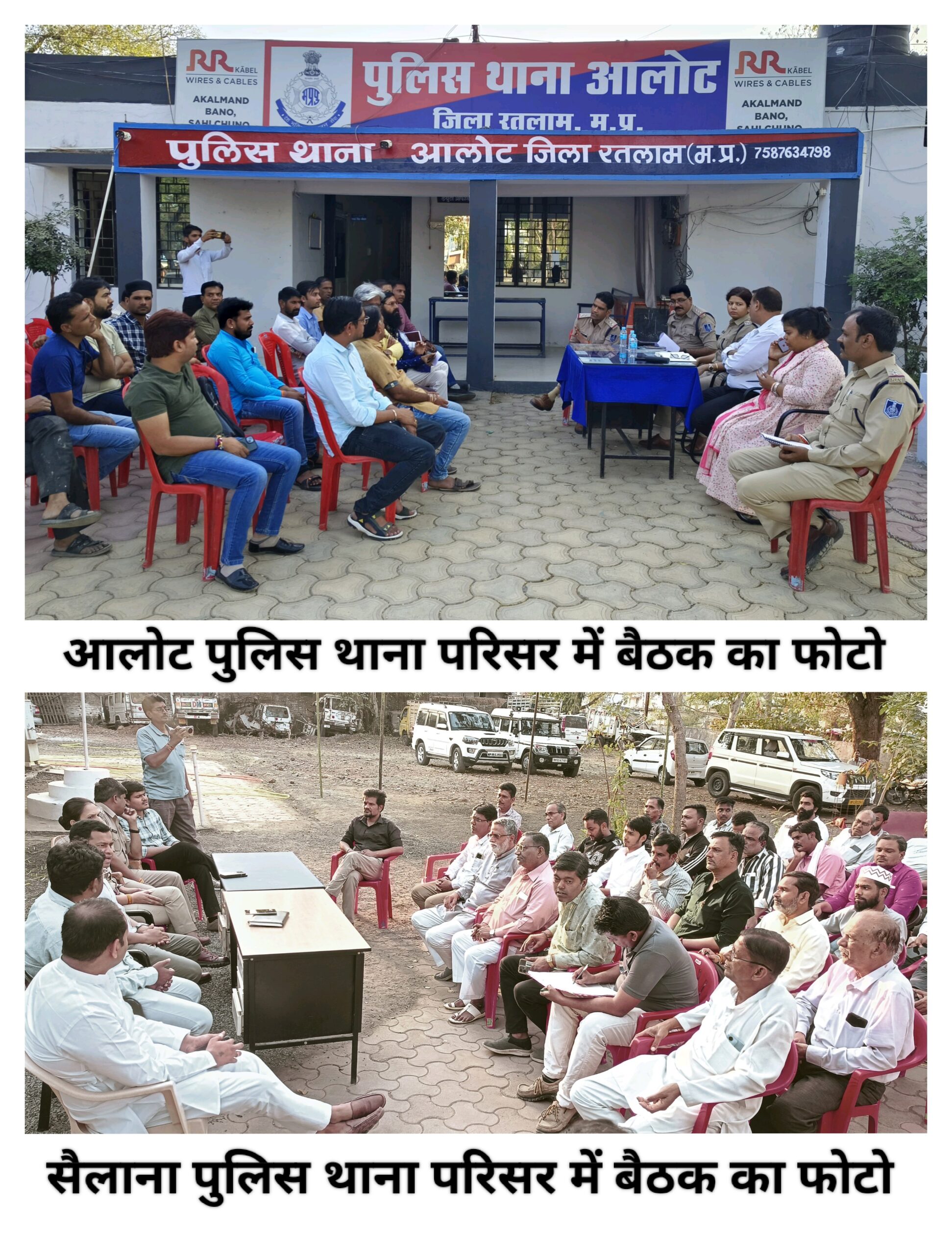 सैलाना थाना परिसर में सैलाना एसडीओपी नीलम बघेल एवं थाना प्रभारी सुरेंद्र गडरिया द्वारा प्रशासनिक अधिकारियों की उपस्थिति में थाना क्षेत्र के जनप्रतिनिधियों, गणमान्य नागरिकों, ग्राम रक्षा समिति के सदस्यों के साथ बैठक लेकर आगामी त्योहारों के संबंध में महत्वपूर्ण विषयों पर चर्चा की गई। अधिकारियों द्वारा आम जन से त्यौहारों को सामाजिक सौहार्द के साथ मनाने, किसी भी प्रकार की अफवाहों पर ध्यान न देने, सोशल मीडिया पर आपत्तिजनक और भड़काऊ पोस्ट नहीं करने के संबंध में लोगों को जागरूक किया गया। जिले के सभी थाना एवं चौकियों पर संबंधित एसडीओपी/सीएसपी एवं थाना चौकी प्रभारियों द्वारा शांति समिति की बैठक आयोजित की गई।