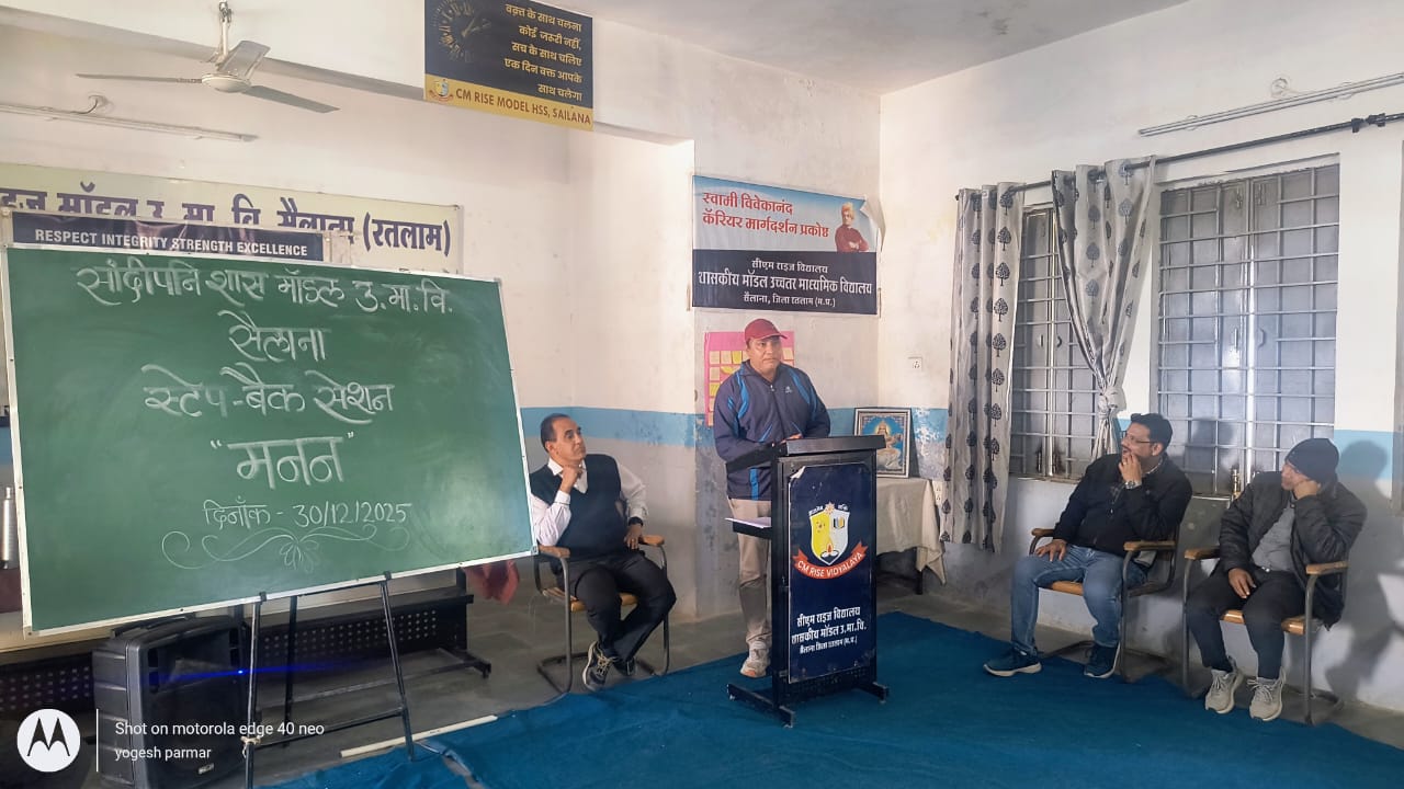 रतलाम- (Ratlam) जिले के सैलाना नगर का सांदीपनि शासकीय मॉडल स्कूल में शैक्षणिक सत्र के प्रारंभ में विद्यालय द्वारा अकादमिक और अन्य गतिविधियों के लिए लक्ष्य निर्धारित किए गए थे। इन लक्ष्यों की प्रगति की समीक्षा करने के लिए शिक्षकों और प्राचार्य के बीच स्वस्थ संवाद एवं चर्चा सत्र “मनन स्टेप बैक”का वर्ष के अंतिम कार्यदिवस में आयोजित किया गया। जिसमें सभी शिक्षकों ने अपने विचारों और कार्य योजना को रखा।