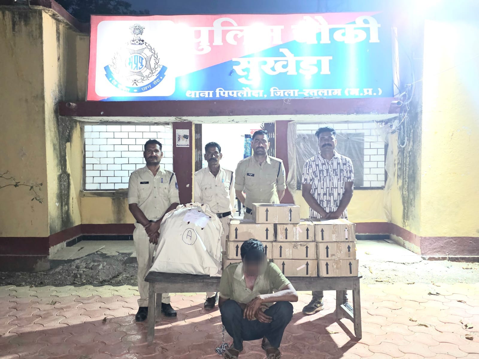 रतलाम जिला पुलिस अधीक्षक के मार्ग दर्शन में अवैध मादक पदार्थ व अवैध शराब के विरुद्ध लगातार की जा रही है।कार्यवाही के क्रम में अतिरिक्त पुलिस अधीक्षक जावरा एसडीओपी के निर्देशन पर पिपलोदा थाना प्रभारी के द्वारा टीम गठित कर मुखबिर सूचना के आधार पर पुलिस चौकी सुखेड़ा द्वारा मंगलवार की रात्रि में चौकी क्षेत्र के सुजापुर-बाराखेड़ा मार्ग पर बनी एक गुमटी से आरोपी गफ्फार बेग पिता मासूम बैग उम्र 45 साल निवासी सुजापुर के कब्जे से 8.544 कि.ग्रा अवैध मादक पदार्थ गांजा तथा 10 पेटी देशी मदिरा जप्त की गयी। आरोपी गफ्फार बैग को गिरफ्तार किया आरोपी के विरुद्ध अपराध क्रमांक धारा 114/2025 धारा 8/20 एनडीपीएस एक्ट ,34(2) आबकारी अधिनियम का पंजीबद्ध कर विवेचना में लिया गया है। तथा आऱोपी को न्यायालय पेश कर एक दिन का पुलिस रिमाण्ड लिया जाकर पुछताछ कि जा रही है।