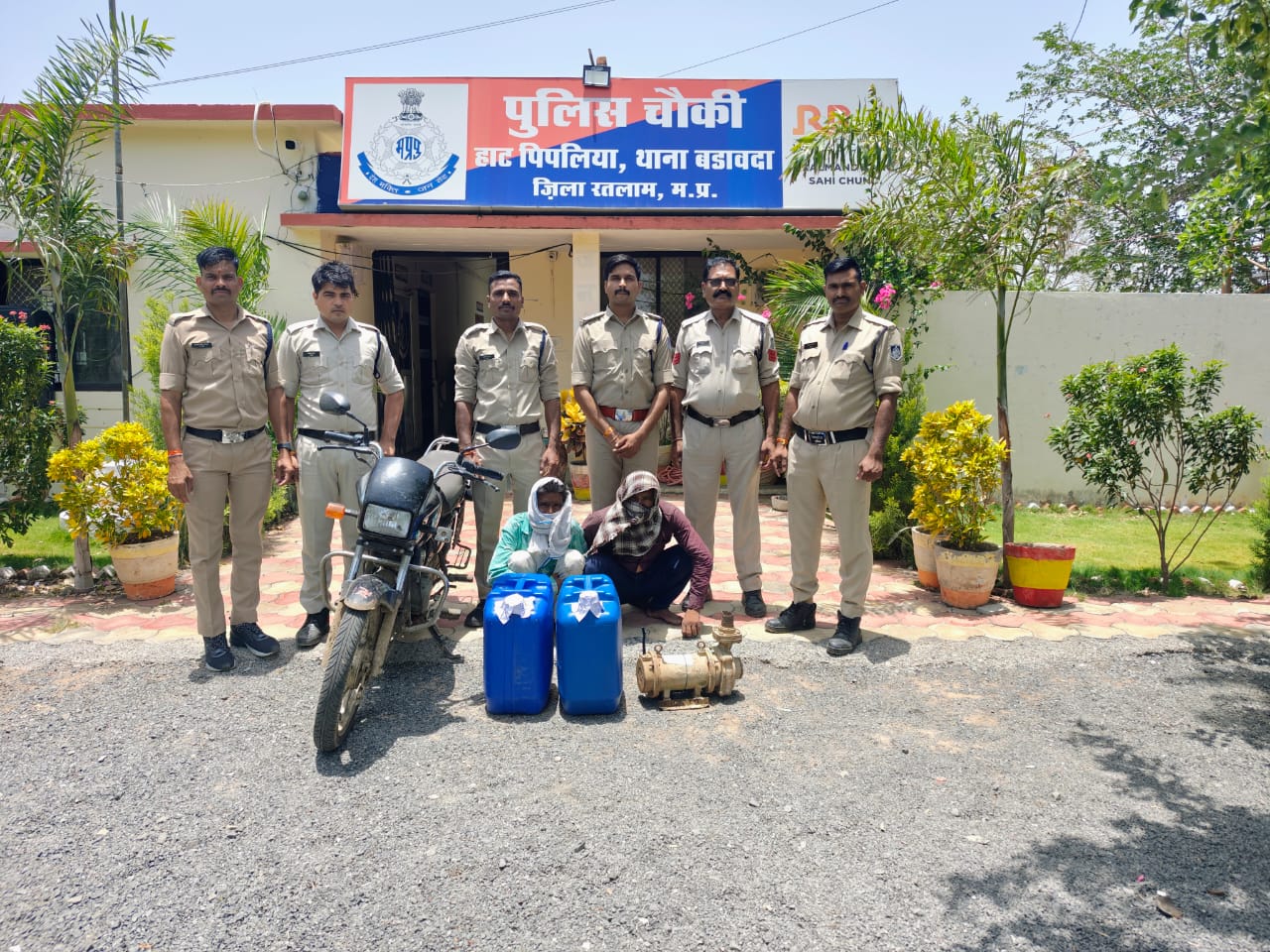 रतलाम जिला पुलिस अधीक्षक अमित कुमार के द्वारा रतलाम जिले मे अवैध शराब की धरपकड़ के लिए निर्देशित किया गया। जोकी रतलाम जिला पुलिस अधीक्षक के निर्देशानुसार, अतिरिक्त पुलिस अधीक्षक राकेश खाखा व एसडीओपी जावरा संदीप मालवीय के मार्ग दर्शन में एवं थाना प्रभारी बडावदा निरीक्षक पृथ्वी सिंह खल्लाटे के नेतृत्व मे 5 जुन गुरुवार को चौकी हाटपिपलिया थाना बडावदा पुलिस द्वारा मजबुत सूचना तंत्र व टीम सहयोग से टोकडा कंजर डेरा के दो कंजरो को एक काले रंग की सफेद पट्टे वाली हिरो स्पलेण्डर मोटर सायकल पर दो नीले रंग की प्लास्टिक की केनो मे भरी 60 लीटर कच्ची महुँवे की हाथ भट्टी की शराब सहित पकडा जिस पर पुलिस थाना बडावदा पर अपराध क्रमांक 197 /2025 धारा 34(2) आबकारी अधिनियम का पंजीबद्ध किया गया।