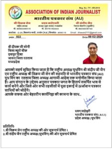 रतलाम- (Ratlam) भारतीय पत्रकार संघ (AIJ) की ओर से संगठन को मजबूत करने की दिशा में एक महत्वपूर्ण निर्णय लिया गया है। राष्ट्रीय अध्यक्ष विक्रम सेन एवं राष्ट्रीय अध्यक्ष (युथ विंग) संदीप जैन की सहमति से दीपक सोनी को भारतीय पत्रकार संघ (युथ विंग) का रतलाम जिला अध्यक्ष मनोनीत किया गया है।