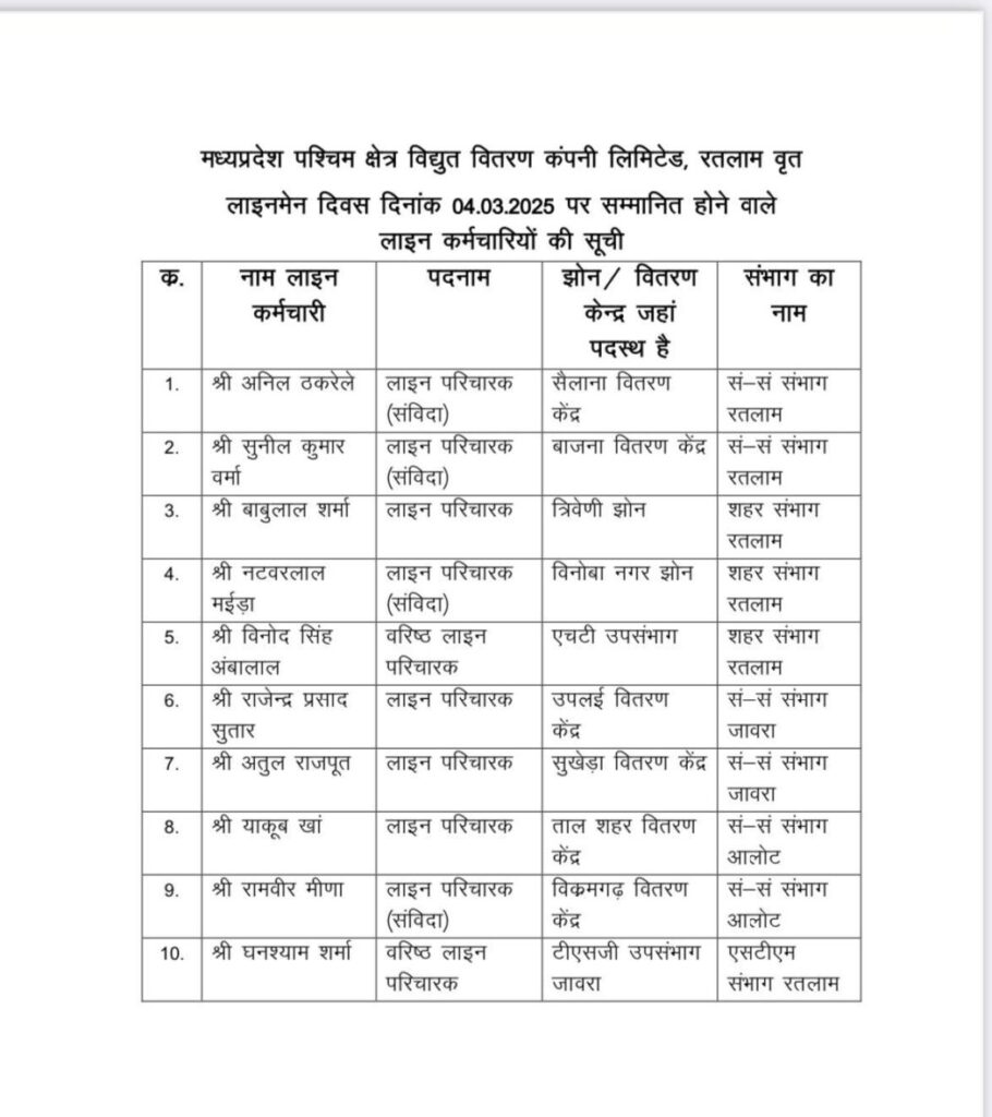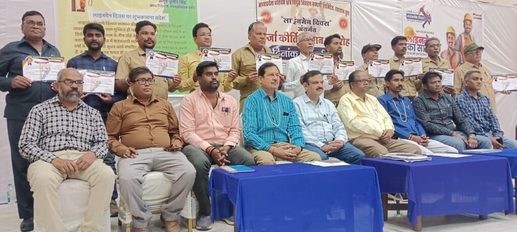 अधीक्षण यंत्री बेंजामिन फ्रेंकलिन की अध्यक्षता रतलाम में आयोजित ‘लाइनमैन दिवस’ के अवसर पर ‘ऊर्जा कीर्ति सम्मान समारोह’ में अधीक्षण यंत्री बेंजामिन फ्रेंकलिन ने लाइनमैनों को संबोधित करते हुए कहा कि उनकी कड़ी मेहनत और समर्पण के बिना विद्युत आपूर्ति की निरंतरता संभव नहीं है। उन्होंने सुरक्षा मानकों का पालन करने और सतर्कता बरतने पर जोर दिया, ताकि दुर्घटनाओं से बचा जा सके। फ्रेंकलिन ने उत्कृष्ट प्रदर्शन करने वाले लाइनमैनों को सम्मानित किया और उनकी सेवाओं की सराहना की।