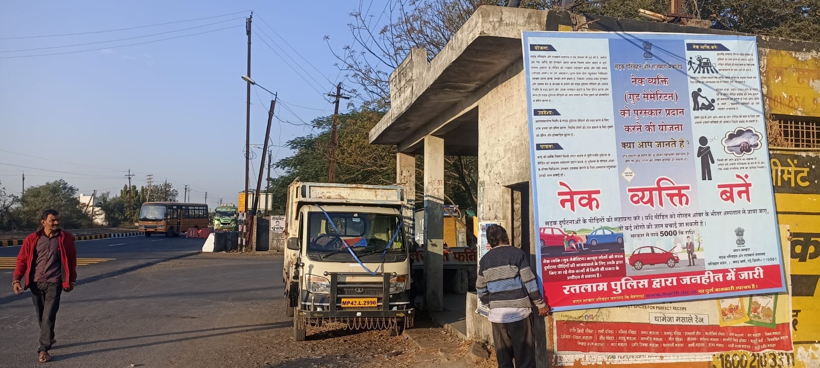 रतलाम (Ratlam,mp)- रविवार को रतलाम जिला पुलिस अधीक्षक अमित कुमार (भा.पु.से.) एवं अतिरिक्त पुलिस अधीक्षक राकेश खाखा (रा.पु.से.) के मार्ग दर्शन में उप पुलिस अधीक्षक यातायात अनिल कुमार राय के निर्देशन में रतलाम यातायात थाना द्वारा गुड सेमेरिटन योजना के प्रभावि कार्यान्वयन एवं व्यापक प्रचार प्रसार के लिए सडक दुर्घटनाओ में पीडित/घायल व्यक्ति को मदद कर एम्बुलेंस द्वारा तत्काल अस्पताल पहुचाने वाले नेक व्यक्ति को शासन द्वारा 5000 रुपये के नगद पुरुस्कार से पुरुस्कृत किये जाने के संबंध में शहर रतलाम के विभिन्न चौराहो पर जागरुकता अभियान चलाया जाकर आमजन को सडक दुर्घटनाओ में पीडित/घायल व्यक्ति की मदद करने के लिए जागरुक किया गया। साथ ही शहर के मुख्य स्थानो नमकीन कलस्टर करमदी रोड, सालाखेडी बायपास, कृषि मंडी मेन गेट, घोडा चौराहा, गर्ल्स कालेज तिराहा, बंजली तिराहा, ईफ्का फैक्ट्री के सामने, पंचेड फंटा एवं पुलिस अधीक्षक कार्यालय पर योजना से संबंधित बडे-बडे होर्डिंग/फ्लैक्स लगाये गये।
